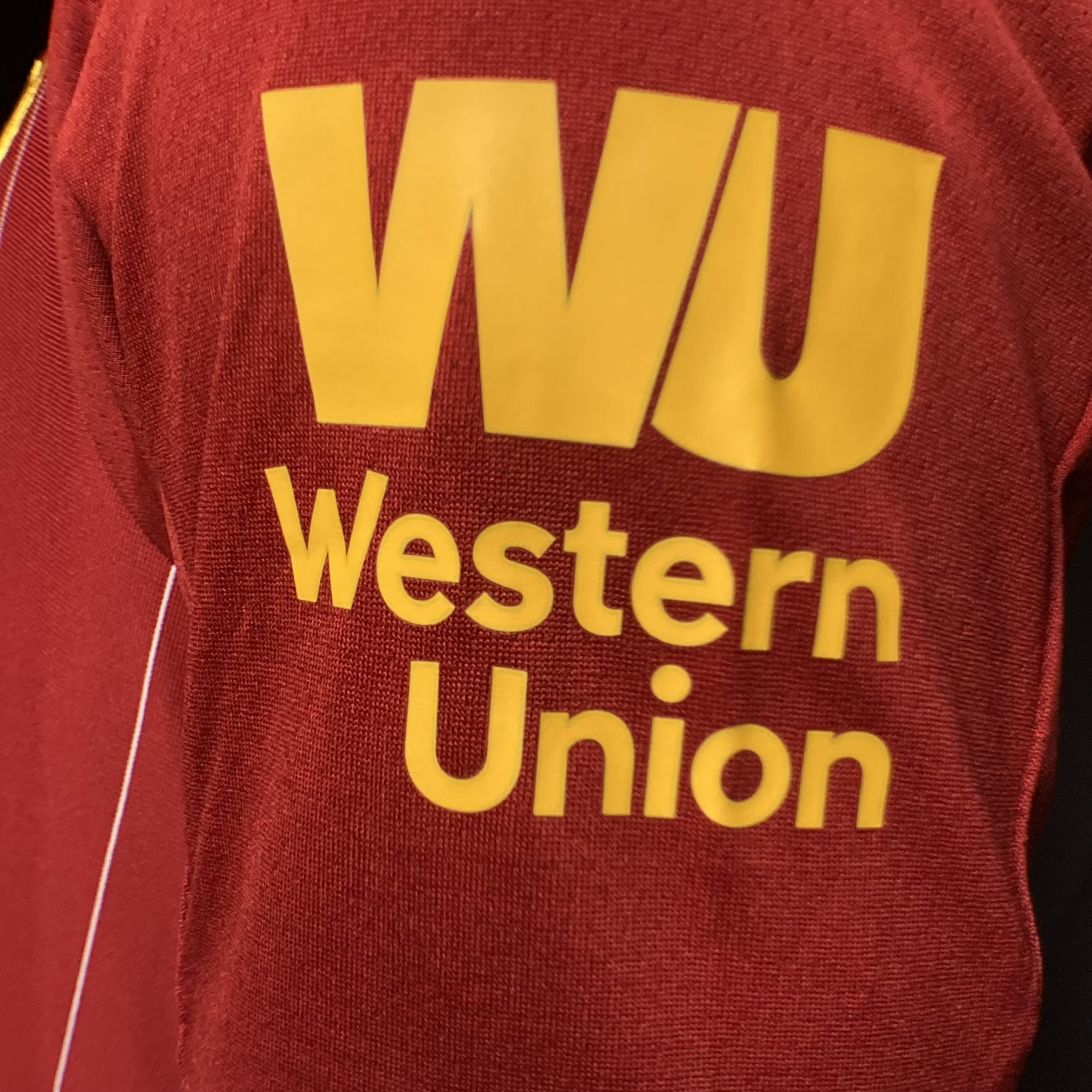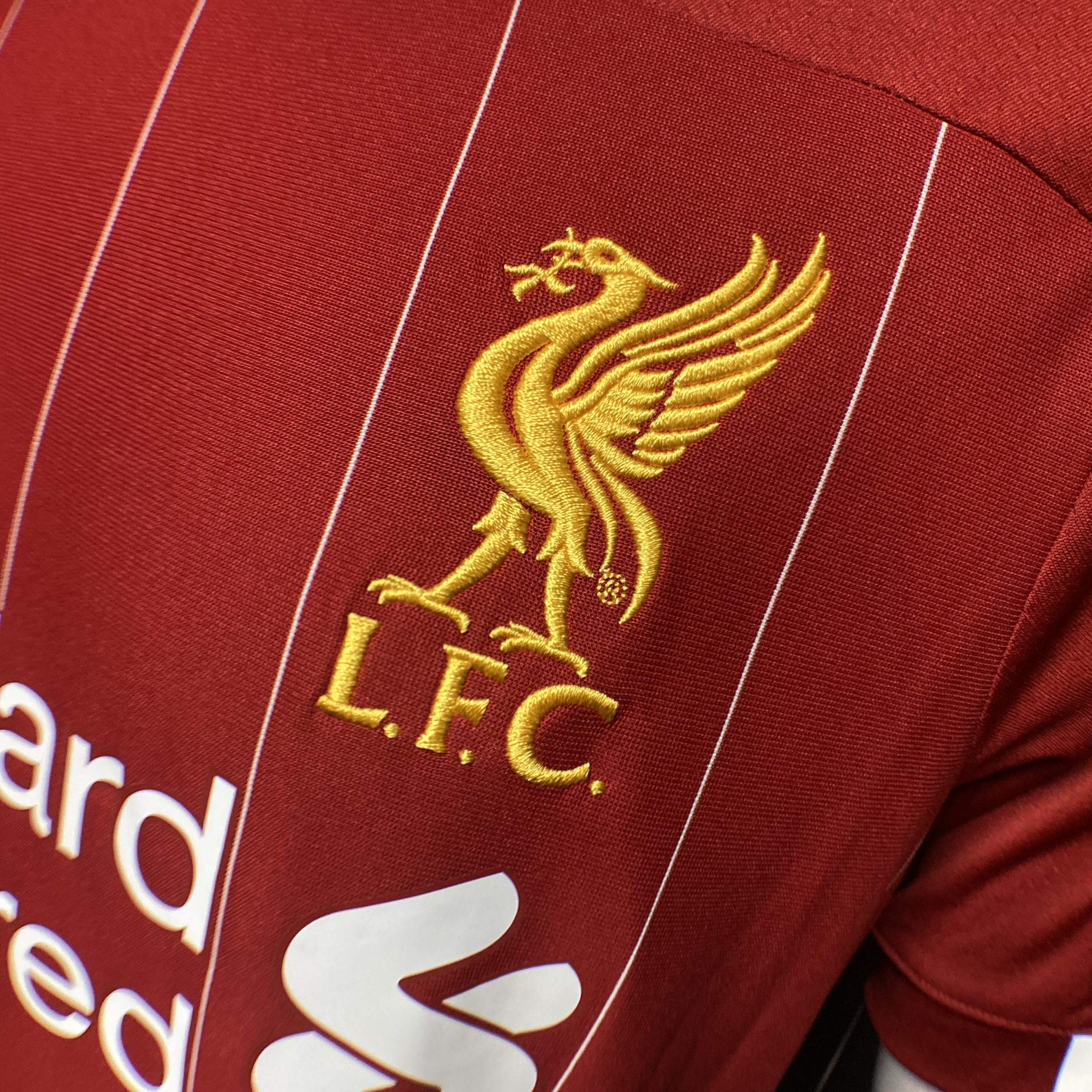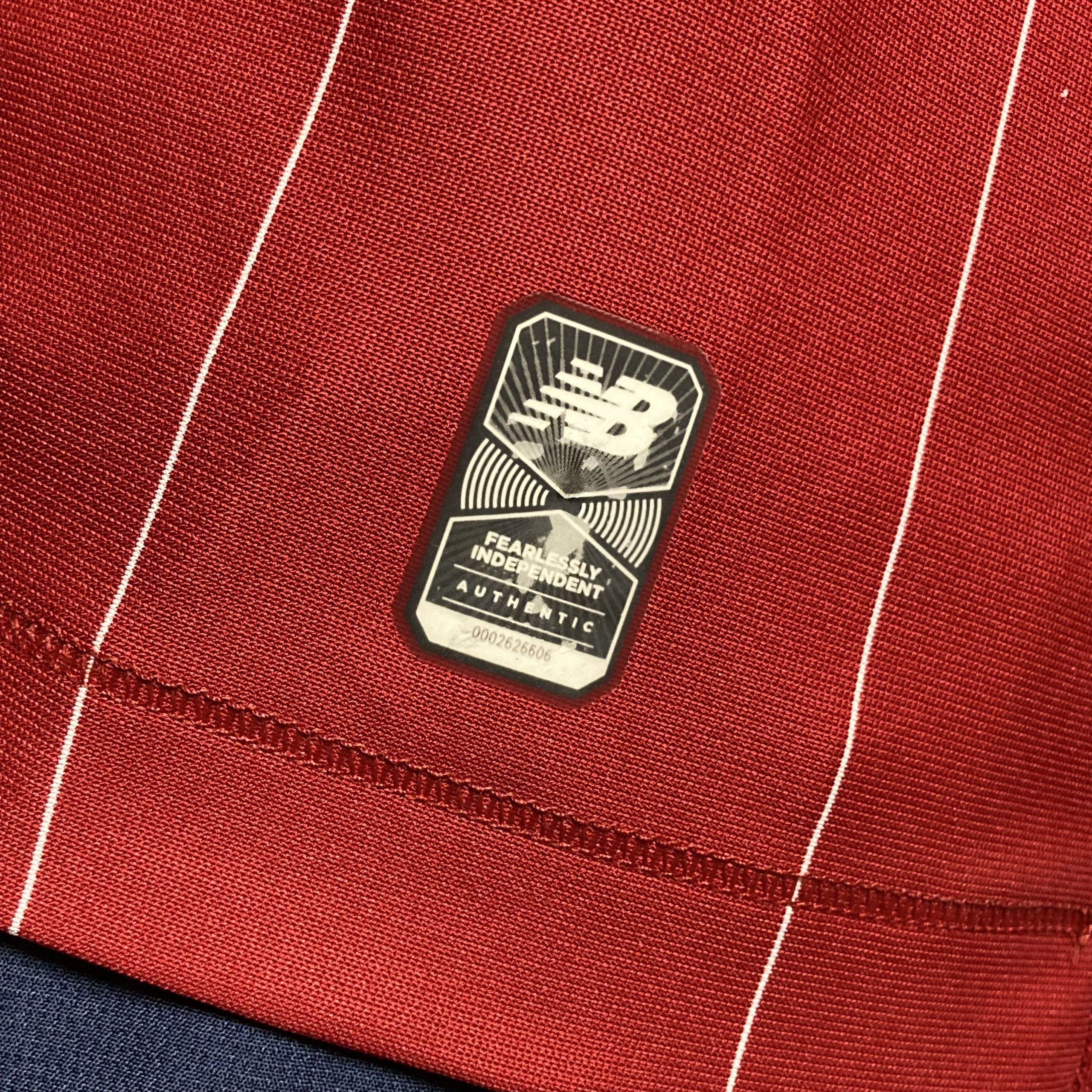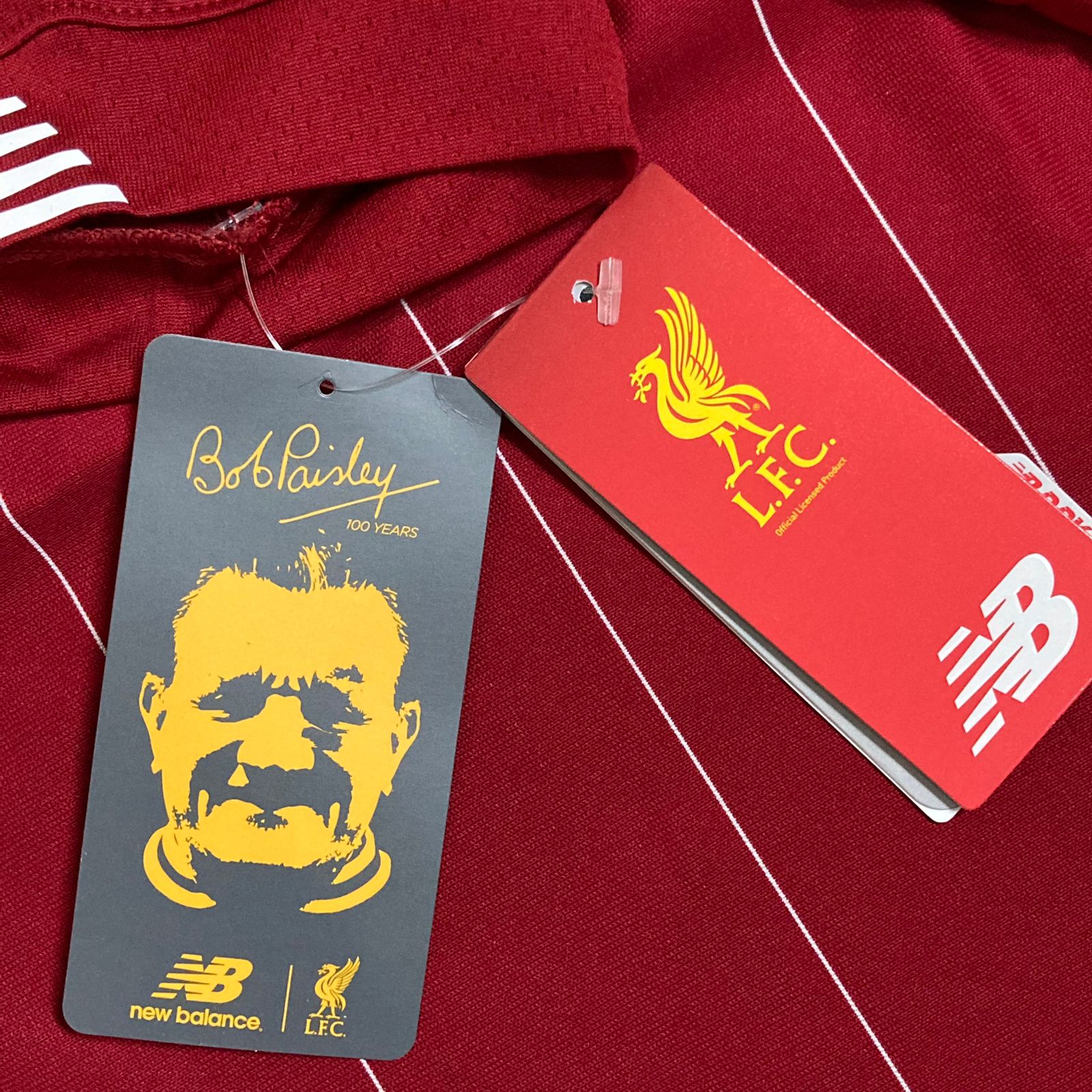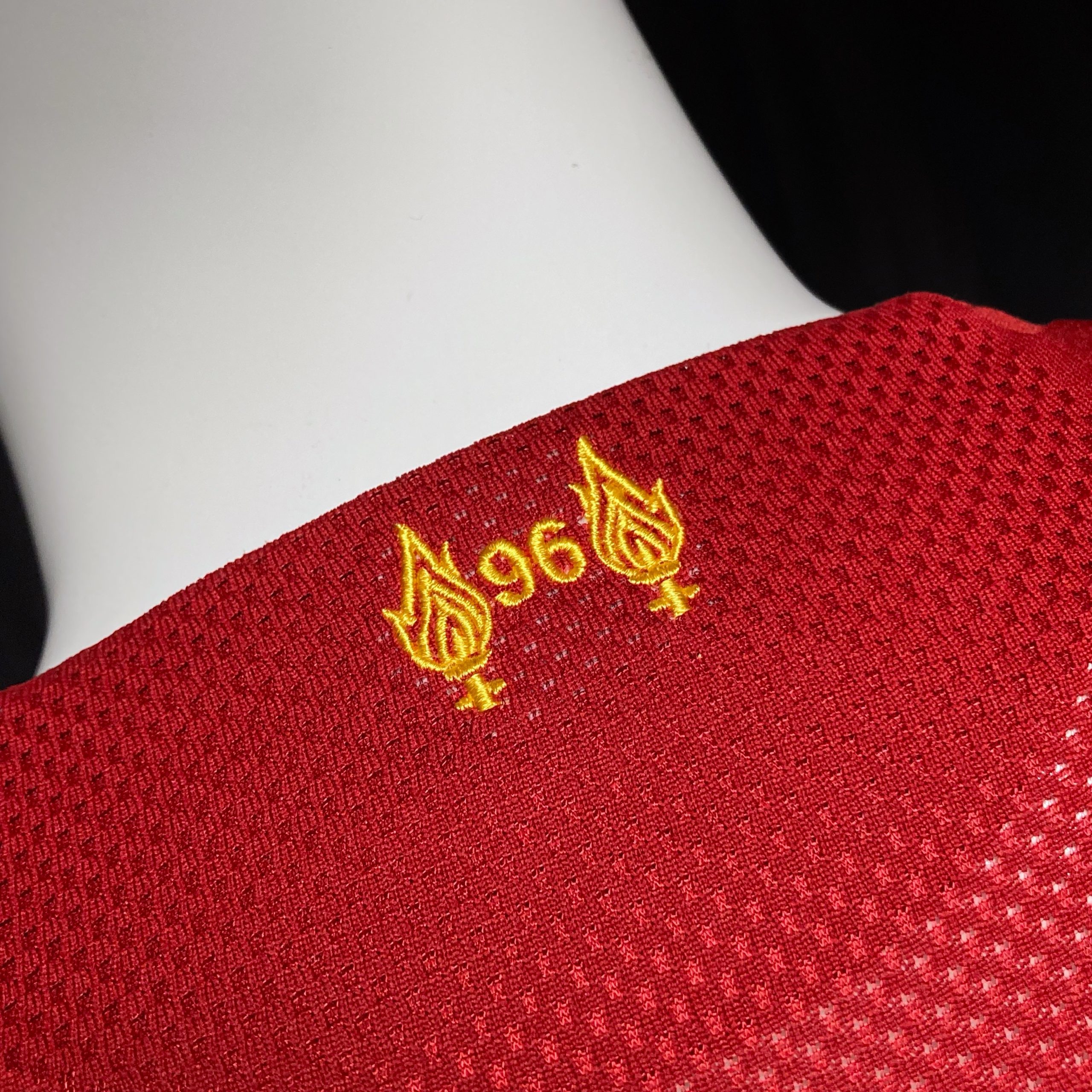 Home kit features a red design with subtle pinstriping, a slim crew-neck collar, and Bob Paisley’s signature, commemorating his 100th birthday. It includes the ‘Eternal Flame’ for Hillsborough victims.